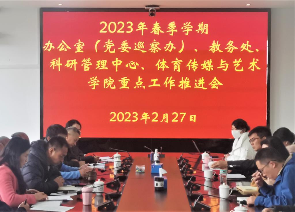 会议由聂真新副院长主持,办公室(党委巡察办)、教务处、体育传媒与艺术学院、科研管理中心全体成员参与。会上,各部门负责人依次对新学期的工作目标、重点工作和工作规划进行汇报。