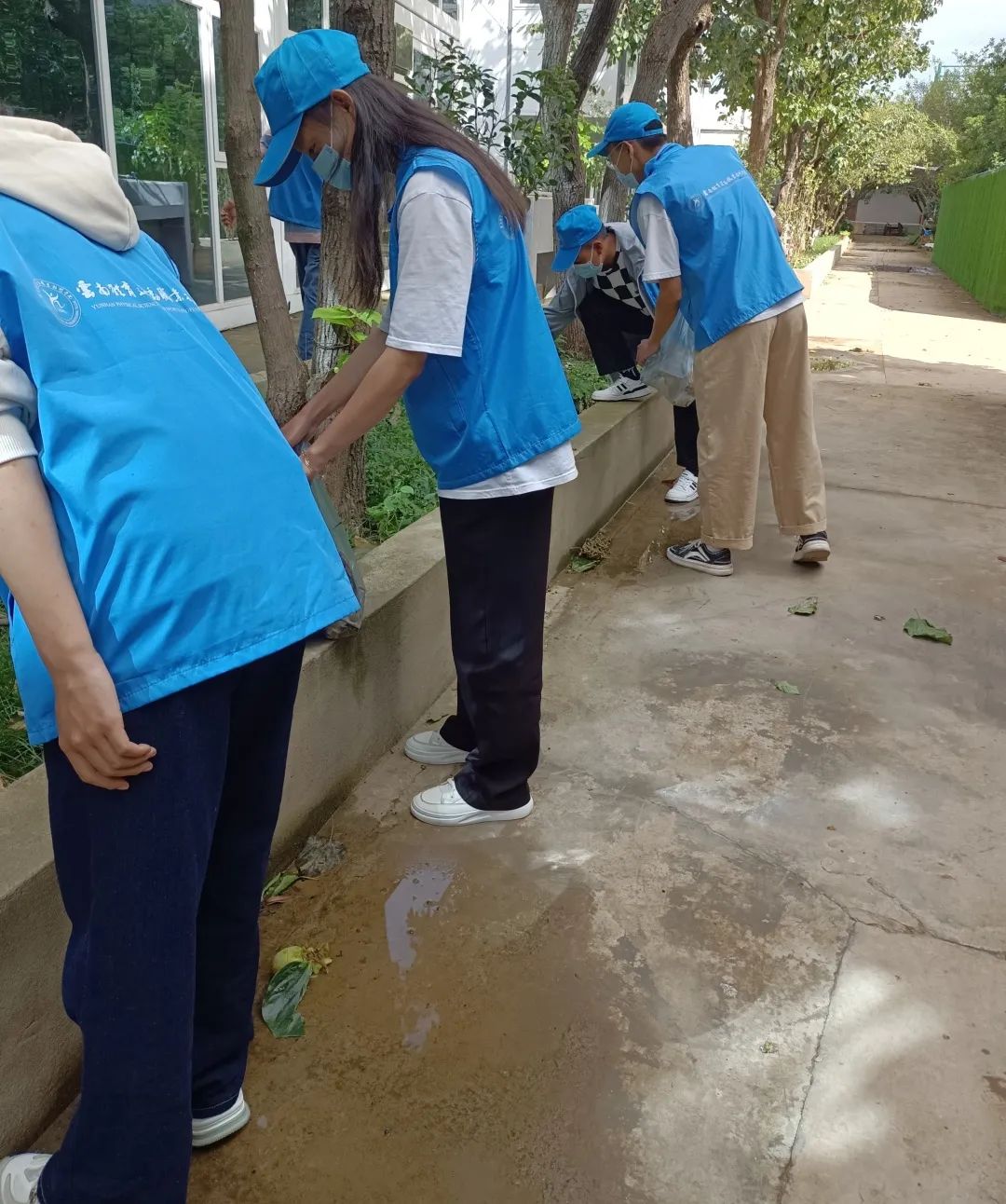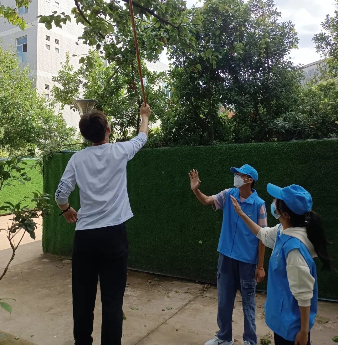 虽然天气炎热但是青年志愿者协会的同学们撸起袖子加油干,对校园各个角落里的垃圾进行清理,开展人人弯腰捡纸,不乱扔,节约每滴水、每度电、每张纸的宣传,分工明确、积极投入使校园焕然一新。