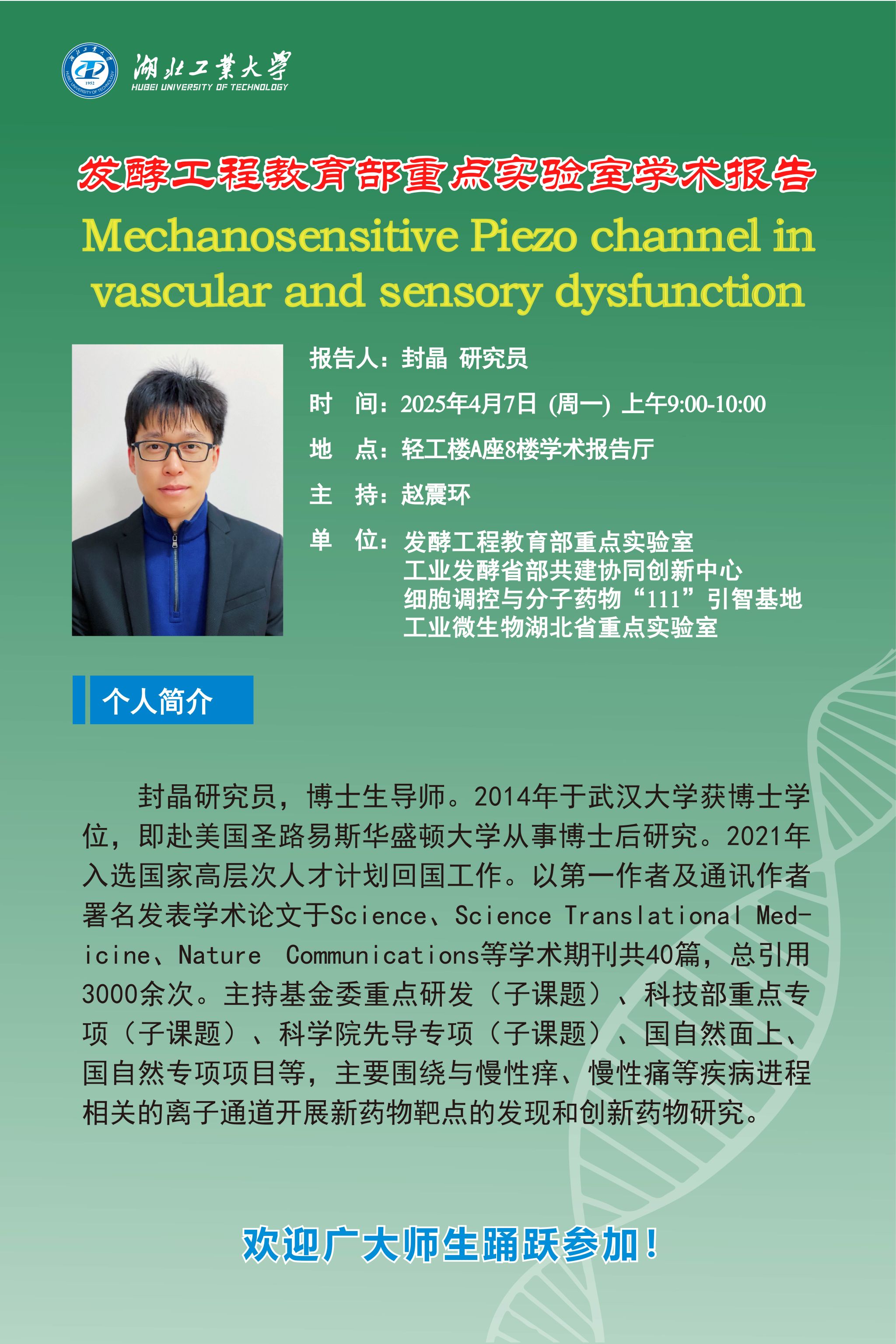 发酵工程教育部重点实验室学术报告:Mechanosensitive Piezo channel in vascular and sensory dysfunction
