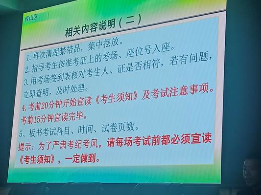 纪委书记金吉斌强调有关考纪考风的规定,要求全体监考教师和考务工作人员按照依法治考的要求,规范考场管理,严格执行统一的操作程序,严肃纪律,杜绝违纪舞弊事件发生,维护社会稳定。