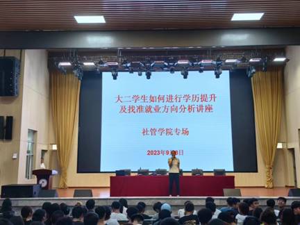 2023年9月8日下午,为进一步增强大二学生职业生涯规划和学历提升意识,促进就业,社管学院在学生礼堂组织召开大二学生如何进行学历提升及找准就业方向分析专题讲座。本次讲座由校企合作企业主讲。