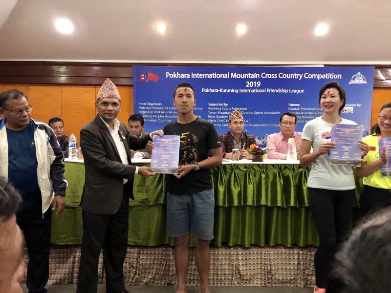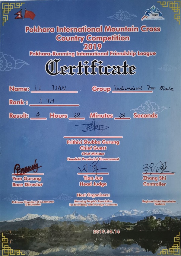 2019年首届尼泊尔博克拉国际山地越野赛中,社管学院18级社会体育专业学生李天,获男子个人组,第五名