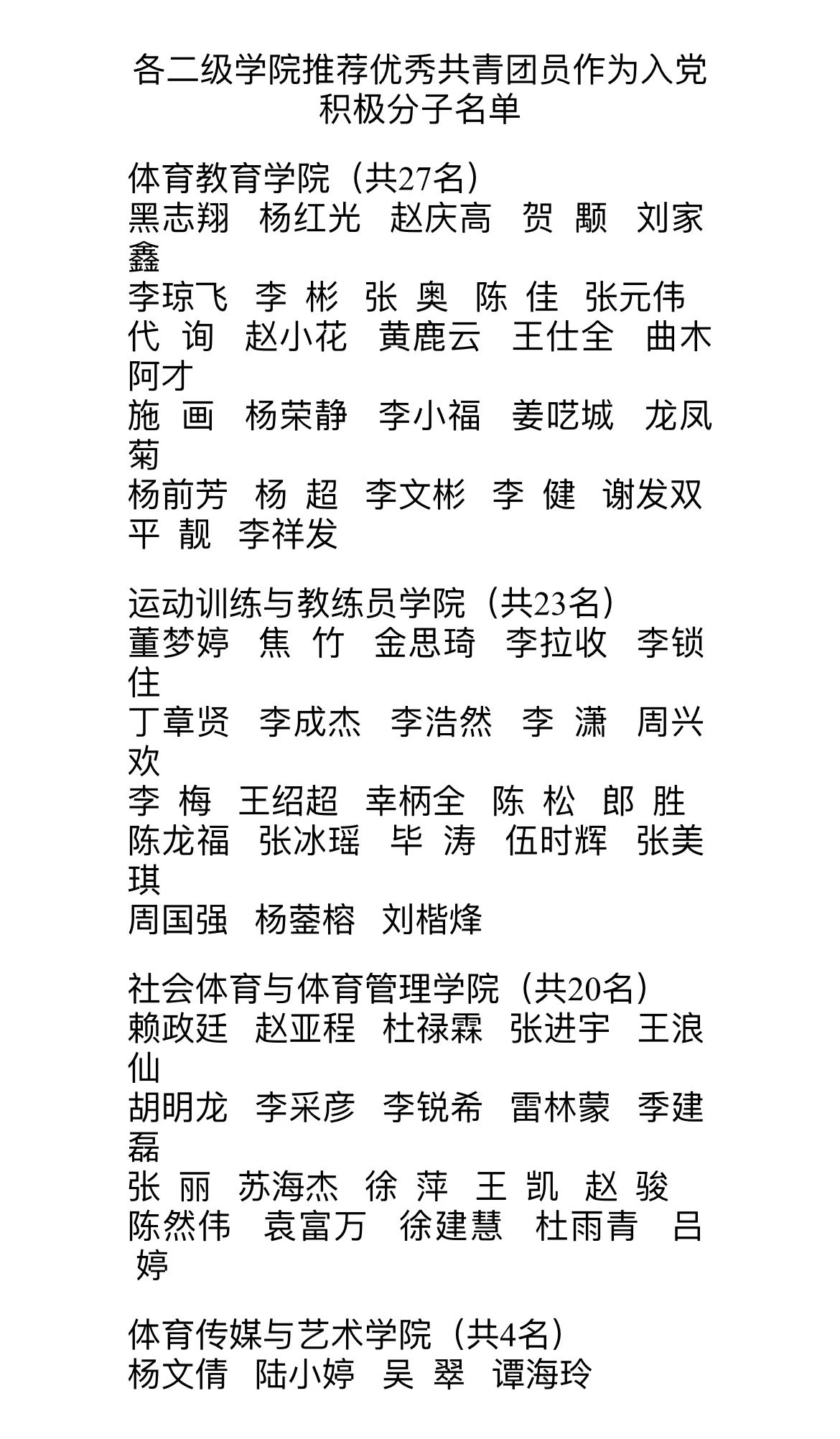 根据《关于开展best365英国在线体育官网2024年共青团推荐优秀团员作为入党积极分子工作的通知》相关规定,经各团支部民主推荐,各二级学院团总支严格把关,共青团best365英国在线体育官网委员会认真审查,拟推荐以下74名共青团员作为入党积极分子,现将人选名单予以公示。公示期共5个工作日,2024年4月7日一4月11日,公示期内如有异议,请向校团委反映。