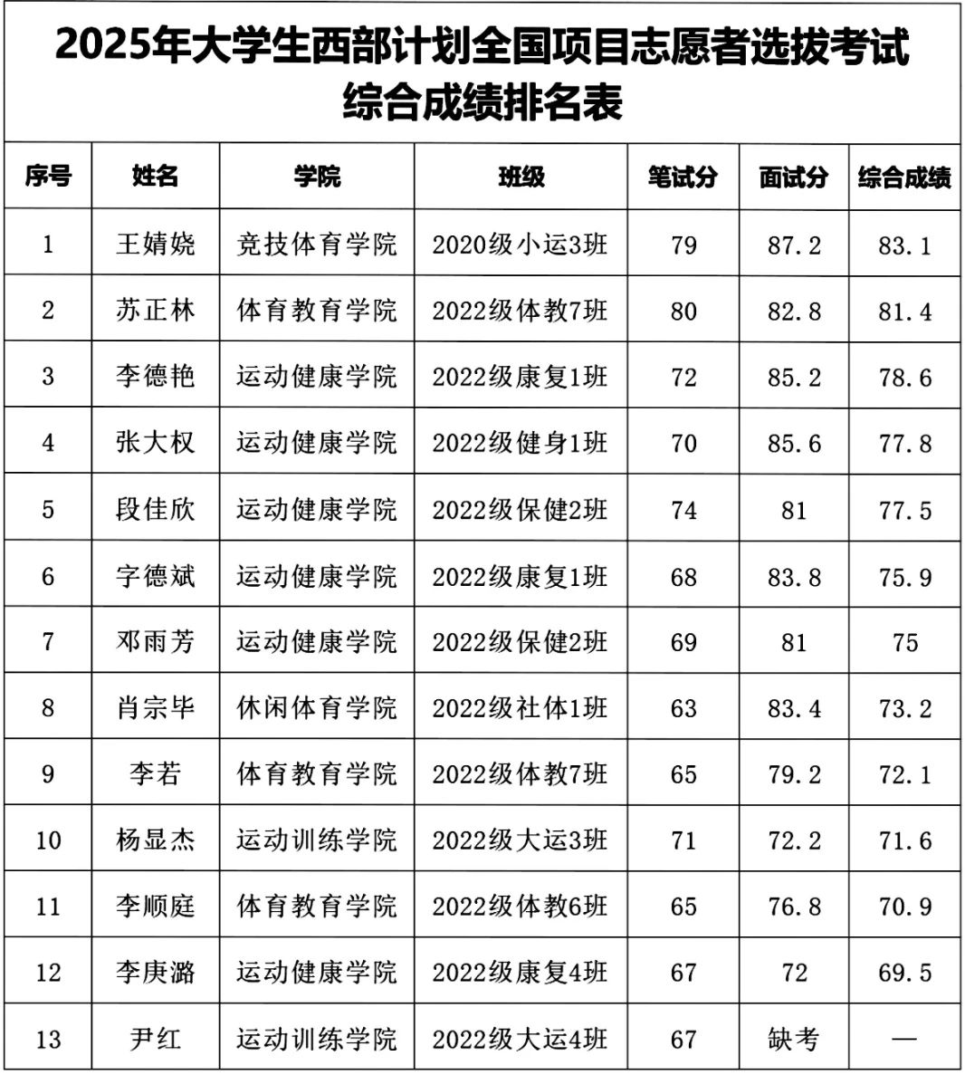 根据共青团云南省委下发关于印发《2025—2026年度云南省大学生志愿服务西部计划实施方案》相关要求,结合学校实际情况,best365英国在线体育官网2025年大学生志愿者服务西部计划工作经报名、审核、笔试、心理健康测试、面试现已顺利结束,线上报名80余人,提交报名表24人,参与笔试21人,参与面试13人。综合成绩由笔试成绩和面试成绩组成,其中笔试成绩和面试成绩各占50%。现将综合成绩排名公示如下,公示期满无异议,将按照排名顺序和岗位要求依次录取,如有放弃则按照名次自动补位。