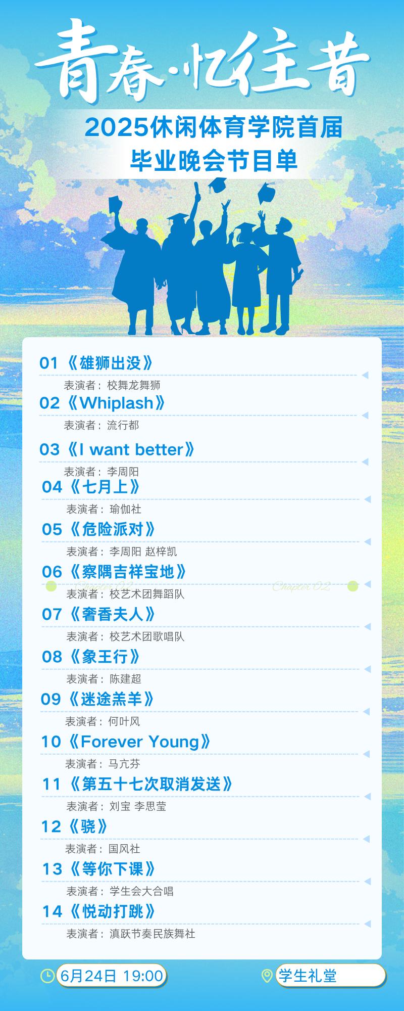 随着毕业季的翩然而至,休闲体育学院主题为“青春·忆往昔——赓续中华魂,奋进新时代”的晚会将于6月24日晚举行。
