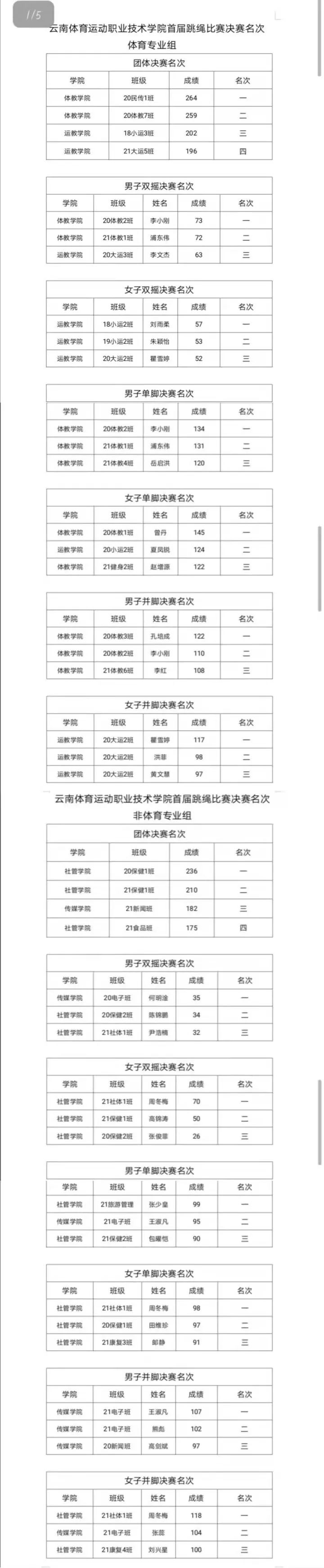 本次比赛项目共有四项,分别是:团体3分钟15人长绳“8”字跳、30秒单摇跳(单脚轮换)、30秒单摇跳(并脚)、30秒双摇跳。参赛个人及团体均通过各二级学院的初赛选拔。