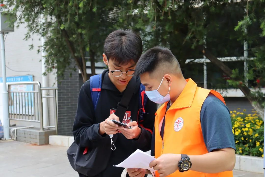 一大早,志愿者们就已在校门口等待,保安叔叔和消毒阿姨也都准备就绪,看着大门缓缓打开,学弟学妹们接踵而至。