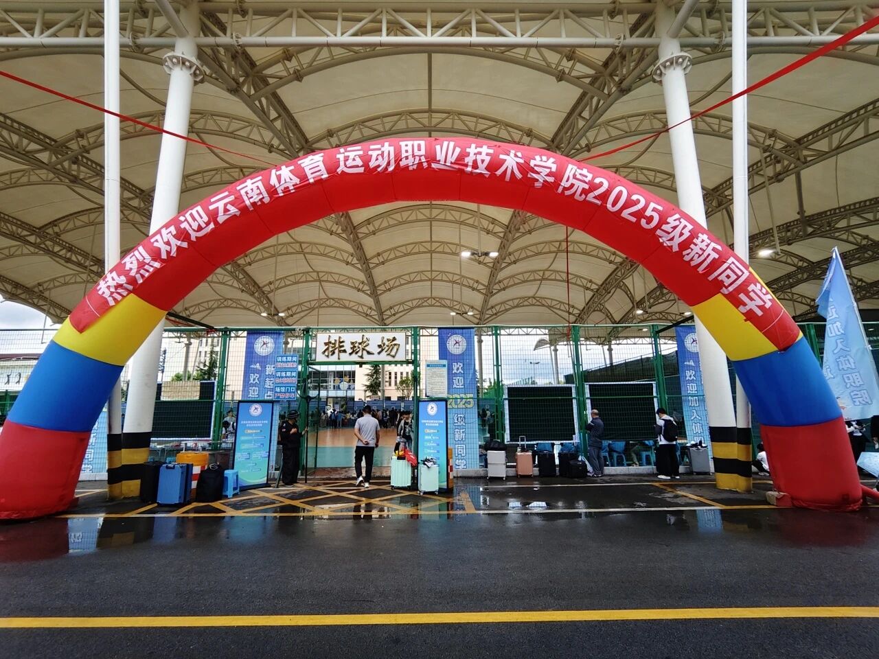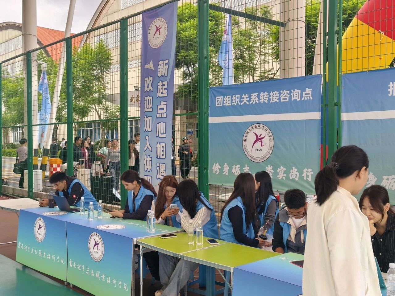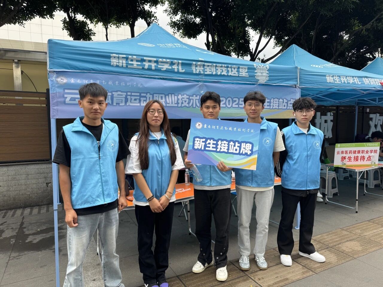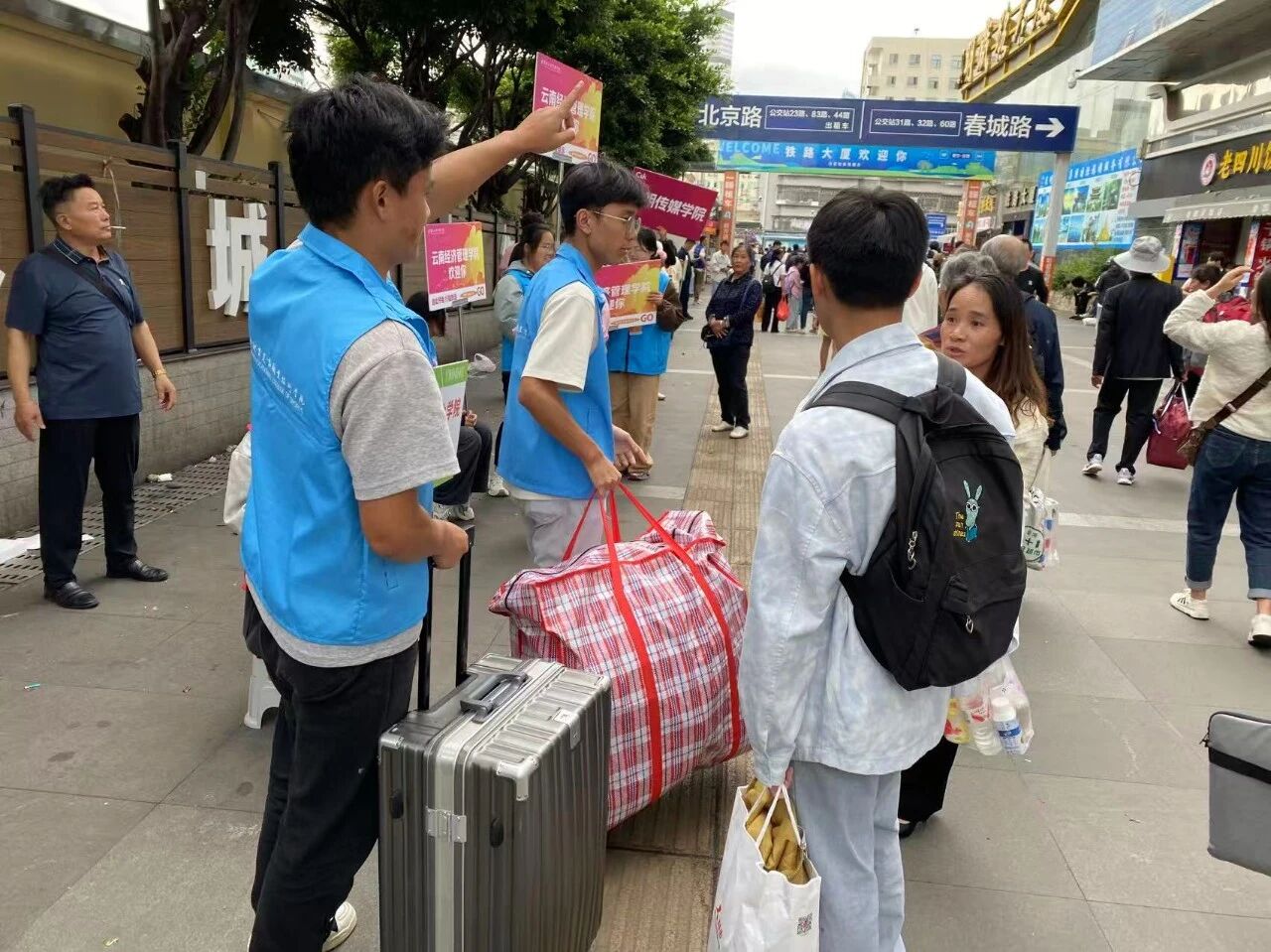在昆明站、东部汽车站等交通枢纽设立多个固定接站点,志愿者们高举“体职院欢迎你”手牌轮岗值守。