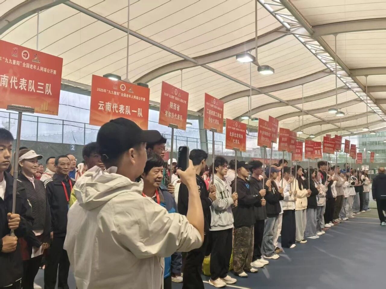 10月10日上午,2025年“九九重阳”全国老年人网球公开赛开幕式上,志愿者们纷纷举起各个代表队的牌子,更好地让各个省份的代表队人员找到属于自己队伍的站位。