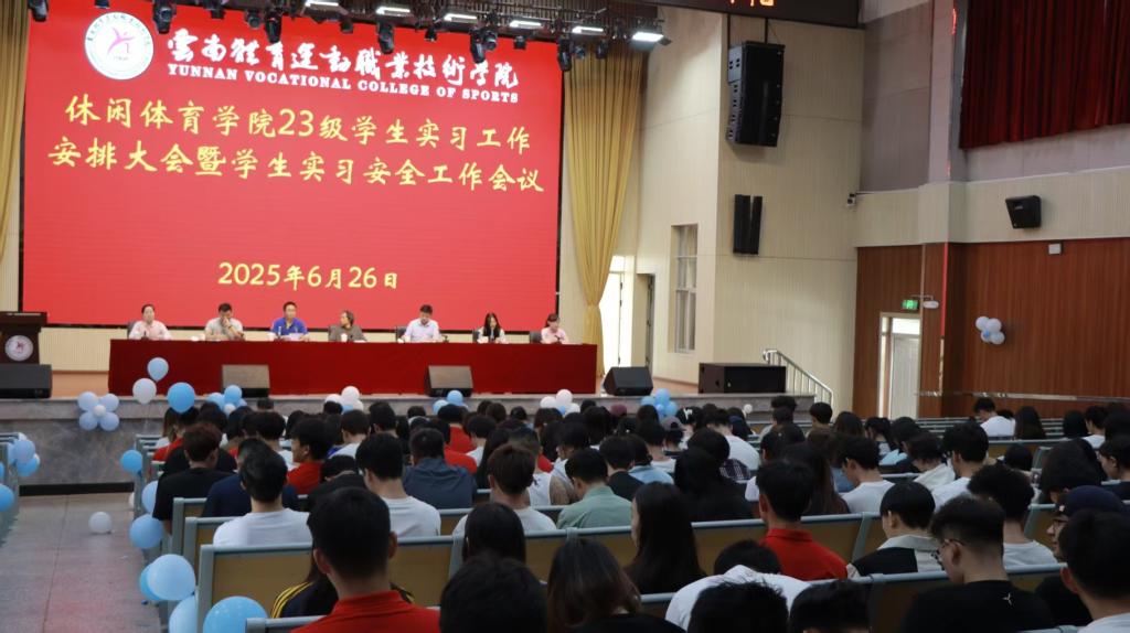 为推进实习工作的顺利开展,引导学生做好实习前的各项准备工作,强化责任意识和安全意识,2025年6月26日中午,休闲体育学院2023级学生实习工作安排大会暨学生实习安全工作会议在学校学生礼堂隆重举行。休闲体育学院党政班子成员,辅导员、专业负责人、相关教师和2023级全体实习同学参加会议。会议由休闲体育学院专职组织员叶超主持。
