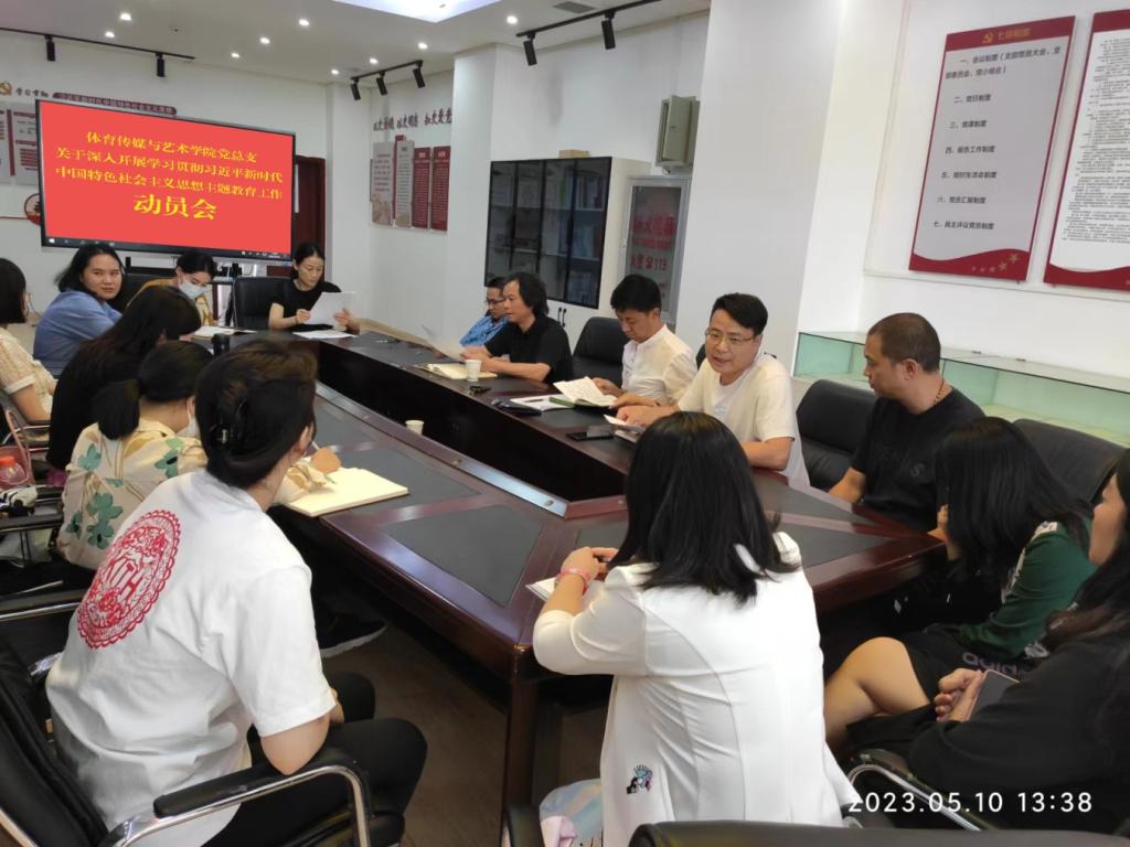 2023年5月10日下午,体育传媒与艺术学院党总支部在学校体操馆二楼会议室组织召开学习贯彻习近平新时代中国特色社会主义思想主题教育工作动员会。体育传媒与艺术学院党总支书记胡天跃作主题教育学习动员讲话,并讲解主题教育的总要求、根本任务、达到的目标、着力解决6个方面等相关问题。