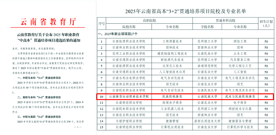 2025年6月3日,云南省教育厅公布2025年职业教育贯通培养改革试点项目名单,best365英国在线体育官网体育教育学院民族传统体育专业与云南民族大学的合作项目成功入选高本贯通高职与本科“3+2”贯通培养项目。试点招生计划为50人,面向2025年参加普通高考的高中毕业生,标志着云南省在民族传统体育领域“高职—本科”贯通培养模式的新突破。