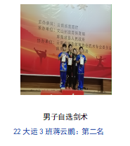 我院高丽琼和任典帅两名武术专任教师,选拔派出4男3女,共计7名同学,参加19个单项和1个集体项目的角逐。在比赛中,我院学生奋力拼搏、敢打敢拼,共斩获:金牌8枚,银牌4枚,铜牌1枚。获集体项目第一名,大学组团体总分第一名的可喜成绩。