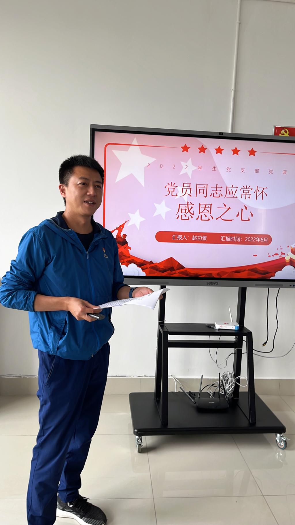 2022年6月29日下午,运动训练与教练员学院学生党支部组织开展了“喜迎二十大、庆祝建党101周年”的主题党日活动。运动训练与教练员学院党总支专职副书记赵功景为学生党支部全体党员讲授了一堂题为《党员干部应常怀感恩之心》的党课。