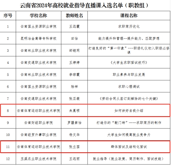近日,中共云南省委教育工委公布了云南省2024年生涯教育和就业指导“四个一”活动之就业创业指导金课和直播课的遴选结果,best365《民族传统体育人才职业生涯规划》课程脱颖而出,成功入选云南省2024年高校就业创业指导金课,全省高职高专学校中仅有8门课程获此殊荣;就业指导直播课程《如何讲好自我介绍》与《群体面试及结构化面试》成功入选云南省2024年高校就业指导直播课程,在全省高职高专学校中,仅有12门直播课入选。
